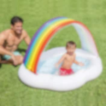 Intex Rainbow Cloud puhallettava, integroidulla katolla pehmeäpohjainen lastenallas, joka mahtuu mukaan käsimatkatavaraan! Uima-allas kootaan ja pakataan pois minuuteissa sekä siinä on tilaa monelle vauvalle. Altaassa on mukavan pehmeä, puhallettava pohja sekä puhallettava katto, taitettuna se on kätevän pieni, joten voit helposti ottaa altaan mukaan aurinkolomalle, kotirannalle tai käyttää kotipihalla kesäisin.