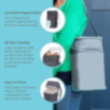 JL Childress 6 Bottle Cooler Grey kätevä ja tehokas pullolaukku ja kylmälaukku noin kuudelle tuttipullollle. Laukku helpottaa lapsen kanssa liikkumista, pitämällä ruokapullot ja -purkit viileinä jopa lähes 8 tuntia. Pullolaukun sisällä on kaksi vetoketjulla eristettyä osastoa, alempaan lokeroon mahtuu kuusi tuttipulloa tai kolme pulloa ja kolme purkkia, ylempään lokeroon kolme ruokapurkkia tai muita ruokailutarvikkeita. Kylmälaukun sisävuori on lämpöeristetty sekä vesitiivis. Laukun voi ripustaa vaunukoukkuun tai asettaa rattaiden tavarakoriin, se mahtuu hyvin myös käsimatkatavaraan tai auton takapenkille. Jällenkäytettävä kylmäkalle sisältyy. Kylmälaukkua on helppo puhdistaa lämpimällä vedellä ja saipulla. Erinomainen apuväline jokapäiväisesti tai matkalle mukaan.