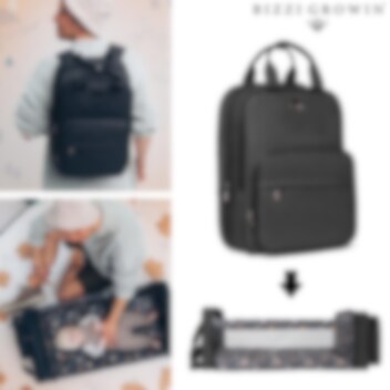 Bizzi Growin RucPod Chelsea Black - laadukas, yhdistetty vauvan matkasänky ja repun muotoinen hoitolaukku, joka on valmistettu tyylikkäästä vegan-nahkasta, on erinomainen apuväline liikkuville vanhemmille. Tämä fiksu ja kaunis hoitolaukku avataan sivusta, jo noin minuutissa saat repusta mukavan matkasängyn vauvallesi. Kahden kevyen, taitettavan sauvan avulla pysyy vauvan sänky hyvin pystyssä (katso video), sen pohjalle asetetaan mukana oleva pehmeä patja, jota voi käyttää erikseen myös vaipanvaihtoaluksena. Matkasänky sopii hyvin myös ulkokäyttöön, sitä varten repusta löytyy yhteensopiva hyttysverkko. RucPod repussa on monta eri taskua ja lokeroa vauvan ja vanhemman tarvikkeille, myös lämpöeristetty tasku tuttipullolle. Kaksi erittäin vahvaa nostokahvaa sekä säädettävät, pehmustetut olkahihnat repun kantamiseen. Vaunun työntöaisaan ripustusta varten on suunniteltu kaksi karabiinikoukulla varustettua ripustushihnaa. Laadukkaat, helposti puhdistettavat ja kestävät materiaalit, Bizzi Growin RucPod' a voi käyttää hoitolaukkuna myös pitempään, kuin vauvasi ei enää pysy sängyssä.