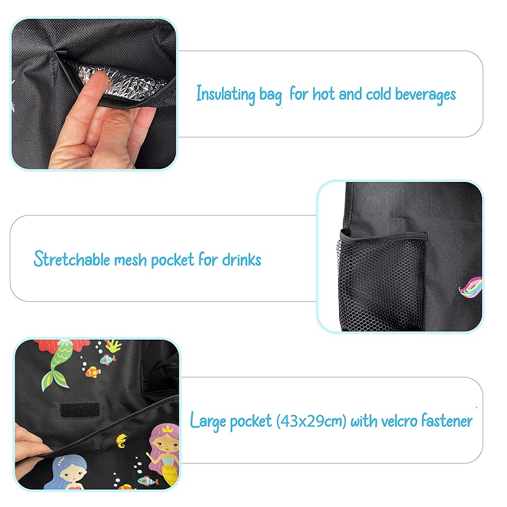 Heckbo Mermaids - yhdistetty istuinsuoja, järjestelijä ja tablettipidike autoon. Verkkotasku sekä lämpöeristetty pullotasku juomien säilytykseen , "touch film" kosketusnäytöllä varustettu & säädettävällä asennolla tablettitasku (30,5 cm halkaisija, max 12" tabelitille) sekä iso tavaratasku tarranauhakiinnityksellä, lapsen kaikille matkatavaroille ja leluille. Järjestelijä kiinnitetään etupenkin selkänojaan säädettävien hihnojen, koukkujen ja klipsien avulla. Järjestelijä auttaa pitämään järjestystä sekä viihdyttää lastasi takapenkillä, samalla kuin suojaat etupenkin takaosaa lialta, naarmuilta ja kulutukselta.