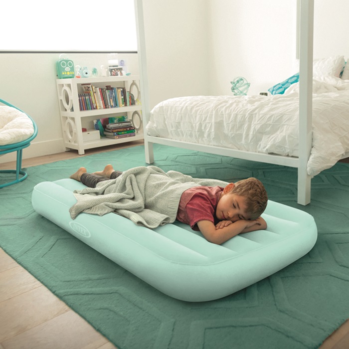 Intex Kidz Travel Bed Set: Intex Kidz Travel Bed kätevä puhallettava matkasänky soveltuu lapsille noin 3-6 ikävuotta. Intex matkasängyssä on pehmeät, korotetut reunat sekä mukava, irrotettava petauspatja. Puhallettavan petauspatjan saa nostettua sängystä niin, että vuoden petaaminen vuodevaatteilla käy helposti. Sängyn puhallettavat reunukset estävät lasta putoamasta lattialle nukkumisen aikana. Sängyn nopeaan täyttämiseen mukana tehokas käsipumppu, setistä löytyy myös näppärä kuljetuskassi. Taitettuna erittäin kompakti lisäsänky - helppo ottaa mukaan matkalle, isovanhempien luo tai käyttää kotona, kuin kaveri tulee yökylään.