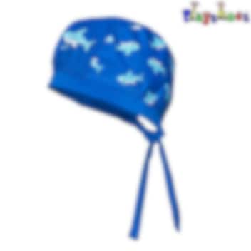Playshoes Shark mukava, hyvännäköinen bandana - tyyppinen lasten aurinkohattu. Hattu, joka suojaa auringon vaarallisilta UV-säteiltä, on valmistettu pehmeästä ja joustavasta Öko-Tex materiaalista. Erittäin sopiva hattu suojakerroin 50+ lomamatkalle tai kesäisin kotirannalle.