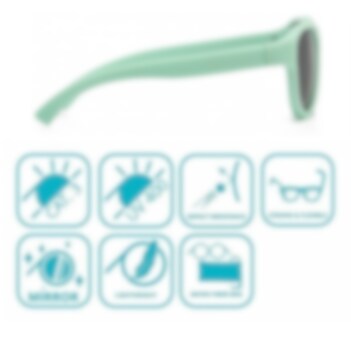 Koolsun Air Greyed Jade tyylikkäät, kestävät aurinkolasit lapsille 0-8 ikävuotta. Koolsun Air-aurinkolasit suojaavat lastasi erinomaisesti auringonvalolta sekä vaaralliseltä UV-sätelyltä, sekä kesällä että talvella. Auronkolasien kehykset ovat valmistettuja kestävästä korkealaatuisesta TPE muovista, niitten Revo- polykarbonaatti-linsseissa on 100% sisäänrakennettu UVA-sekä UVB-säteilyn suoja. Sen takia linssien UV-suojaominaisuus ei vähene käytössä, naarmujen sattuessa.