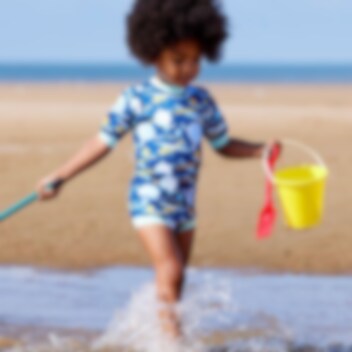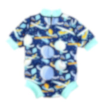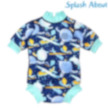 Splashabout Happy Nappy Wetsuit Up In The Air yhdisttetty vauvan märkäpuku ja uimavaippa, joka pitää vauvan lämpimänä sekä estää epämiellyttvät vuodot vedessä. Happy Nappy uimavaippa-uimapuku on valmistettu pehmeästä, kestävästä sekä vuotoja estävästä neopreenikankaasta. Uimavaipassa on tiiviit ja joustavat mukavan muotoiset jalanympärykset. Puvun pitkät hihat pitää vauvan ihon vedessä ollessa lämpimänä pidempään. Pukua on helppo pukea ja riisua, puvussa on myös SPF 50 UV-suoja.