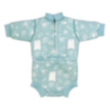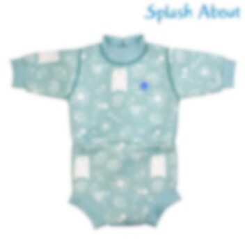 Splashabout Happy Nappy Wetsuit Sunny Bear yhdisttetty vauvan märkäpuku ja uimavaippa, joka pitää vauvan lämpimänä sekä estää epämiellyttvät vuodot vedessä. Happy Nappy uimavaippa-uimapuku on valmistettu pehmeästä, kestävästä sekä vuotoja estävästä neopreenikankaasta. Uimavaipassa on tiiviit ja joustavat mukavan muotoiset jalanympärykset. Puvun pitkät hihat pitää vauvan ihon vedessä ollessa lämpimänä pidempään. Pukua on helppo pukea ja riisua, puvussa on myös SPF 50 UV-suoja.