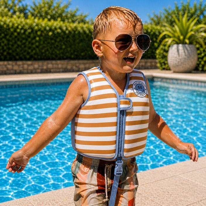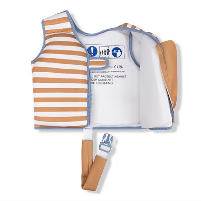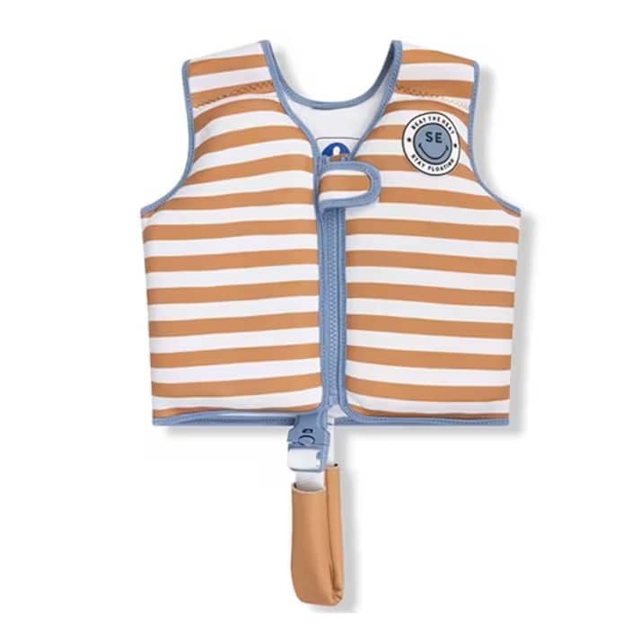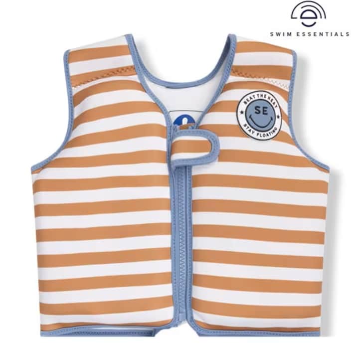 Swim Essentials Brown Stripes lasten uimaliivi on kellunta-apuväline, joka auttaa lasta tottumaan veteen. Pehmeä, kevyt, sisäänrakennetuilla kellukke-elementeillä varustettu neopreeniliivi takaa oikean asennon vedessä, antaen lapsen liikkua vapaasti. Uimaliivin voi pakata täysin litteäksi, se ottaa vain vähän tilaa matkalaukussasi. Pehmeä, nopeasti kuivuva neopreenikangas estää ihoärsytyksen ja heirtumat. Uimaliivi kiinnitetään vetoketjulla ja tarranauhakiinnikeellä liivin edestä. Liivissä on säädettävä jalkahihna, joka turvaa liivin pysymisen paikoillaan. Kelluntaliivi ei ole pelastusväline, se on erittäin hyvä apuväline uintiin opetteluun ja lasten vesileikkeihin.