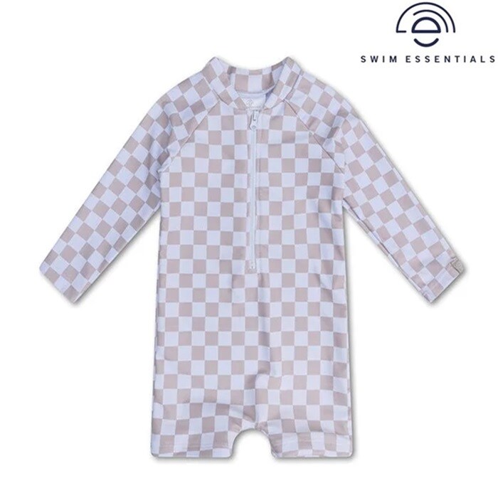 Swim Essentials Sand Check - laadukas, hyvännäköinen ja kätevä yksiosainen lasten uimapuku & aurinkosuojapuku. Uimapuku, joka suojaa auringon vaarallisilta UV-säteiltä, on valmistettu pehmeästä ja joustavasta stretch-materiaalista, jossa pienet tyylikkäät dinosaurus-motiivit. Erittäin mukava pitkähihainen ja hyvin suojaava uima-ja aurinkosuojapuku suojakerroin SPF50+ vauvoille ja pienemmille lapsille.