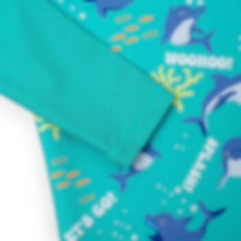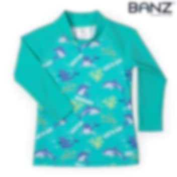 Tunnustetun australialaisen Banz-merkin laadukas, mukava ja hyvännäköinen lasten uimapaita & aurinkosuojapaita täyspitkillä hihoilla. Uimapaita, joka suojaa lasta auringon vaarallisilta UV-säteiltä, on valmistettu pehmeästä ja joustavasta materiaalista, joka on hyvin kloorin kestävä sekä suojattu kankaan vaalenemiselta auringossa. Puvussa on pehmeät ihonystävälliset saumat sekä tyylikkäät delfiini-motiivit. Mukava ja kestävä UV-suuojapaita suojakerroin UPF50+ lomamatkalle tai kesäisin rannalle. Sopii hyvin yhteen Banz Dolphins uimashortsien ja kesähatun kanssa.