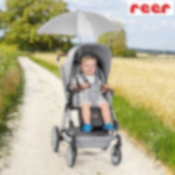 Reer Shinesafe+ Grey Melange yleismallinen aurinkovarjo vaunuihin ja rattaisiin. Aurinkovarjon halkaisija on noin 80 cm sekä pituus 68 cm, varjoa on helppo kiinnittää mihin tahansa vaunuun ja rattaaseen sekä säätää hyvin haluamansa asentoon. Aurinkovarjossa on tehokas UPF 50+ UV-säteilyn suoja, joten se suojaa lastasi tehokkaasti auringolta. Taitettuna päivänvarjo on sen verran pienti, että mahtuu helposti vaunun tavarakoriin tai käsilaukkuun. Valmistettu laadukkaasta melange-kankaasta.