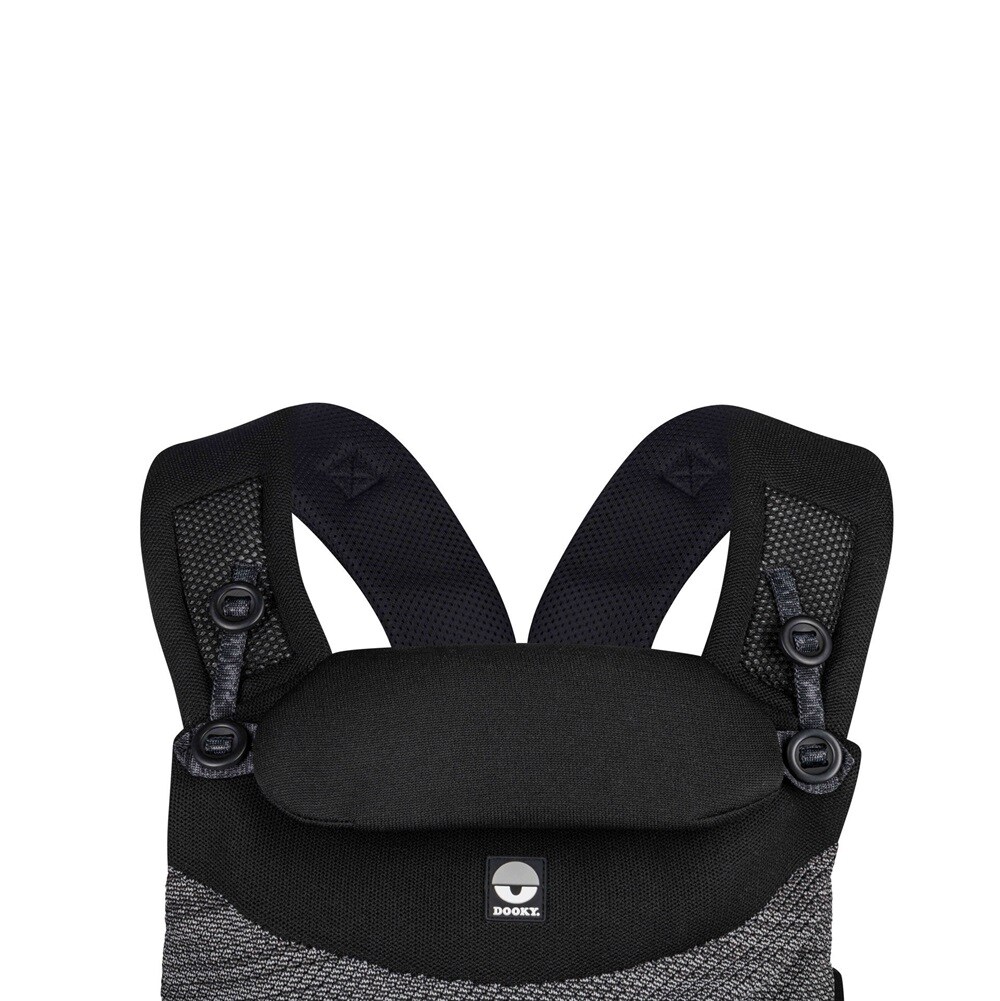 Dooky Terra Nova Black Carrier - mahdollistaa ihokontaktin vauvan kanssa samalla, kun kätesi jäävät vapaiksi arjen askareisiin. Ergonominen M-asento (polvet peppua ylempänä) tukee vauvan luonnollista kehitystä ja varmistaa turvallisen, miellyttävän istuma-asennon. Säädettävä istuinosa ja jalkatuet mukautuvat lapsesi kasvuun, tarjoten optimaalisen tuen jokaisessa vaiheessa. Pehmeä ja joustava neuloskangas tuntuu miellyttävältä sekä vauvaa että kantajaa vasten. Kantajan mukavuus on viimeistelty leveillä, pehmustetuilla olkahihnoilla ja säädettävällä vyötärövyöllä, jotka jakavat painon tasaisesti ja vähentävät selän ja hartioiden kuormitusta. Kolme kantotapaa tekevät repusta erittäin kätevän: kasvot kantajaan päin ensimmäisinä kuukausina, kasvot eteenpäin vauvan kiinnostuessa ympäristöstä sekä selässä kantaminen noin 6 kuukauden iästä alkaen. Tukeva rakenne ja säädettävä pään- ja niskantuki takaavat hyvän tuen kaikissa asennoissa. Dooky Carrier Terra Nova kasvaa lapsesi mukana syntymästä aina noin 3 vuoden ikään saakka. Se täyttää EN 13209-2:2015 -turvallisuusstandardin vaatimukset. Sopii käytettäväksi enintään 159 cm vyötärönympärykselle – täydellinen valinta aktiiviseen arkeen ja yhteisiin seikkailuihin.