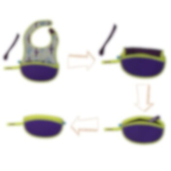 • Taitetaan vetoketjulla pieneksi taskuksi ruokailun jälkeen (lusikka mahtuu taskuun)