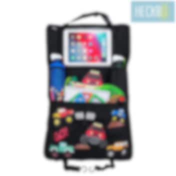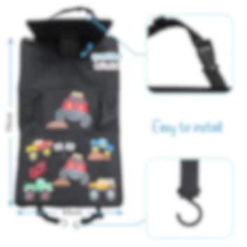 Heckbo Monster Trucks - yhdistetty istuinsuoja, järjestelijä ja tablettipidike autoon. Verkkotasku sekä lämpöeristetty pullotasku juomien säilytykseen , "touch film" kosketusnäytöllä varustettu & säädettävällä asennolla tablettitasku (30,5 cm halkaisija, max 12" tabelitille) sekä iso tavaratasku tarranauhakiinnityksellä, lapsen kaikille matkatavaroille ja leluille. Järjestelijä kiinnitetään etupenkin selkänojaan säädettävien hihnojen, koukkujen ja klipsien avulla. Järjestelijä auttaa pitämään järjestystä sekä viihdyttää lastasi takapenkillä, samalla kuin suojaat etupenkin takaosaa lialta, naarmuilta ja kulutukselta.