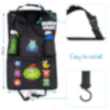 Heckbo Monsters - yhdistetty istuinsuoja, järjestelijä ja tablettipidike autoon. Verkkotasku sekä lämpöeristetty pullotasku juomien säilytykseen , "touch film" kosketusnäytöllä varustettu & säädettävällä asennolla tablettitasku (30,5 cm halkaisija, max 12" tabelitille) sekä iso tavaratasku tarranauhakiinnityksellä, lapsen kaikille matkatavaroille ja leluille. Järjestelijä kiinnitetään etupenkin selkänojaan säädettävien hihnojen, koukkujen ja klipsien avulla. Järjestelijä auttaa pitämään järjestystä sekä viihdyttää lastasi takapenkillä, samalla kuin suojaat etupenkin takaosaa lialta, naarmuilta ja kulutukselta.