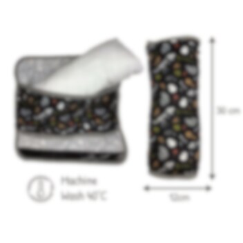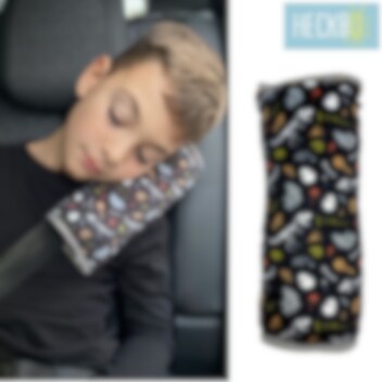 Heckbo Dino Skeleton mukava pehmeästä fleece-kankaasta turvavyötyyny autoon estää hiertymiä sekä antaa tukea lapsen päälle ja niskalle nukkuessa. Turvavyötyyny kiinnitetään turvavyöhön tarranauha-kiinnikkeen avulla, sitä on helppo asentaa sekä irrottaa. Tyynyn päällistä voi konepestä erikseen. Erittäin mukava apuväline lisämään mukavuutta autossa.