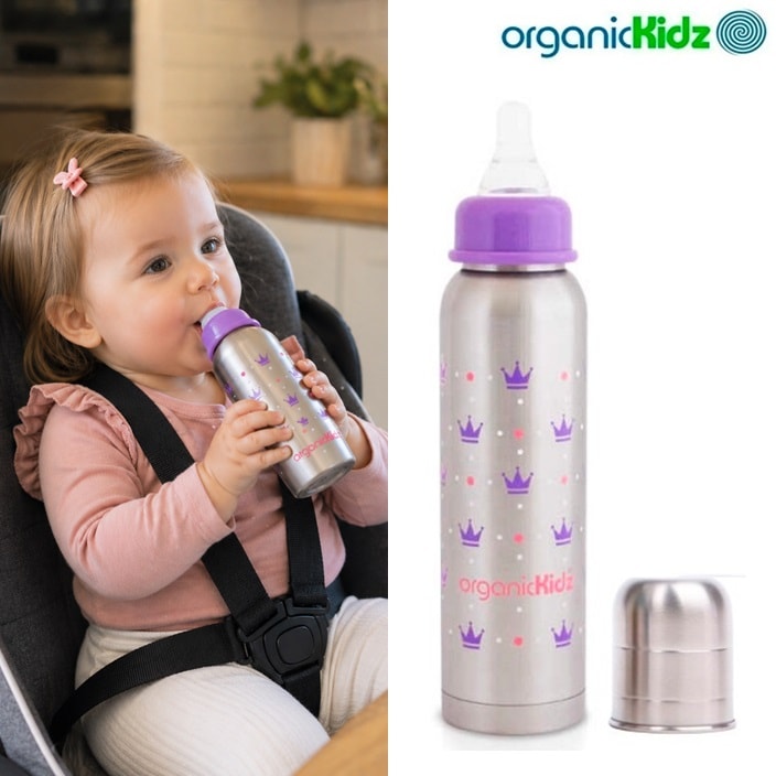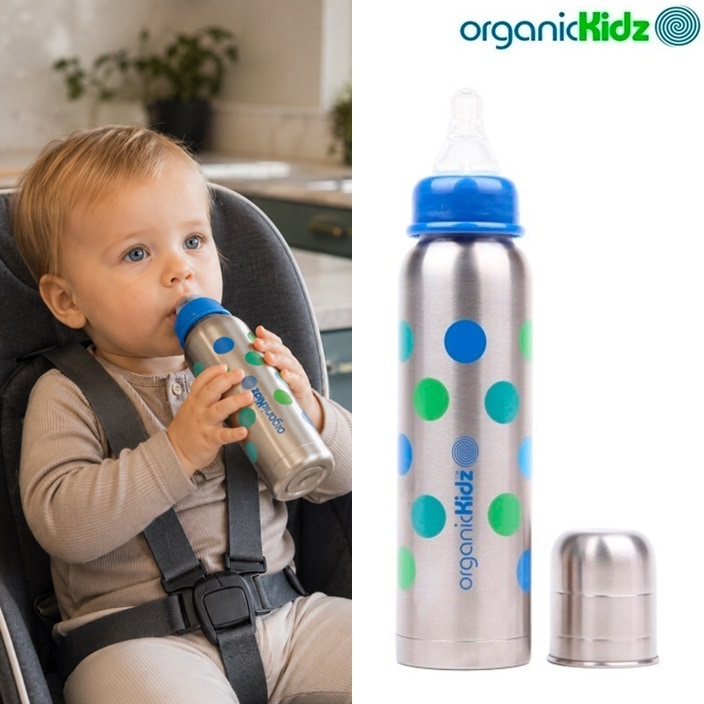 OrganicKidz terästuttipullo – turvallinen ja ympäristöystävällinen valinta lapsellesi. OrganicKidz-terästuttipullo yhdistää käytännöllisyyden, kestävyyden ja turvallisuuden. Ruostumattomasta teräksestä valmistettu tuttipullo on luonnostaan antibakteerinen, lähes särkymätön ja kestävä – täydellinen lapsen käyttöön syntymästä kouluikään asti. Kaikki OrganicKidz-tuotteet ovat BPA-, ftalaatti- ja PVC-vapaita, joten ne ovat turvallisia käyttää päivittäin. Termospullo pitää juoman viileänä tai lämpimänä jopa 6 tuntia, mikä tekee siitä ihanteellisen ratkaisun retkille, matkoille tai arjen kiireisiin.
