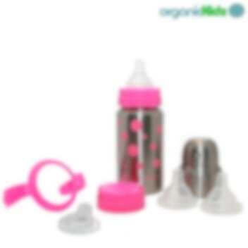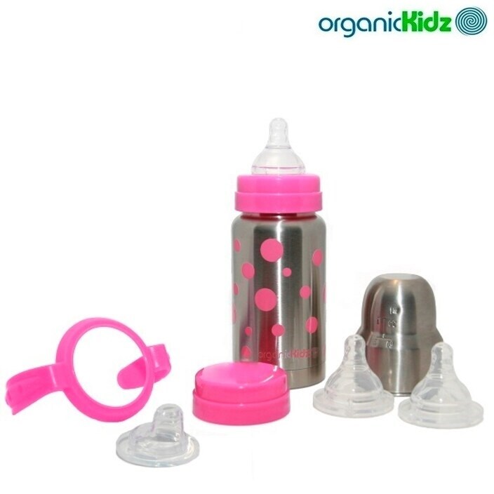 Organic Kidz "Baby Grows up" setti, jossa erittäin kestävä ja kätevä termos- tuttipullo ruostumattomasta teräksestä, kolme eri virtauksella tuttia, juomanokka, muovikorkki, kansi sekä mukikahva. Termospullo pitää lapsen juoman kylmänä tai lämpimänä jopa 6 tuntia. Kätevä ja varma vaihtoehto muovi-ja alumiinipulloille. Lapsen varttuessa saat tuttipullon muuttaa helposti termosmukiksi tai tavanomaiseksi termos-juomapulloksi. Erinomainen apuväline matkalla, kaupungilla tai luontoretkellä. Kestävä ja ympäristöystävällinen OrganicKidz pullo ei sisällä lapselle haitallisia ftalaatteja, bisfenol A-ta eikä PVC:tä.