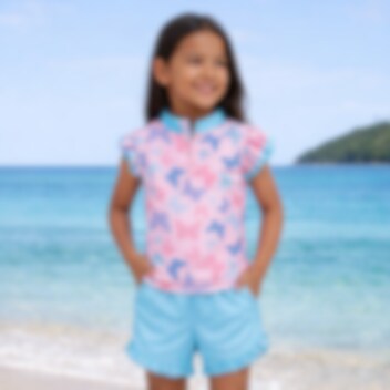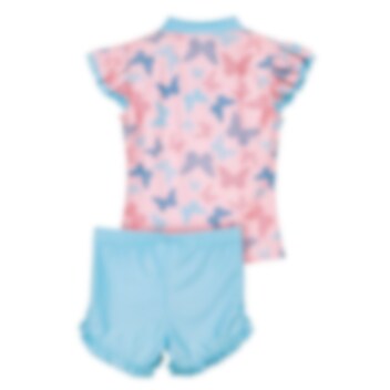 Playshoes Butterfly hyvännäköinen ja suojaava kaksiosainen UV-uimapuku , jossa paidassa lyhyet hihat sekä housuissa lyhyet lahkeet. Uimapuku suojaa auringon vaarallisilta UV-säteiltä ja se on valmistettu pehmeästä joustavasta Öko-Tex materiaalista suojakerroin 50+. Erittäin kätevä käyttää lomamatkalla tai kesäisella kotirannalla.